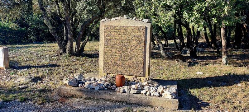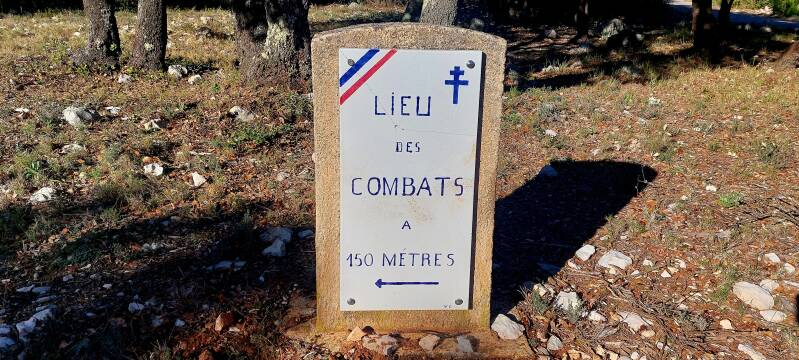 A la fin du sentier, le chemin goudronné apparaît mais aussi une stèle en hommage aux combattants morts pour la France.