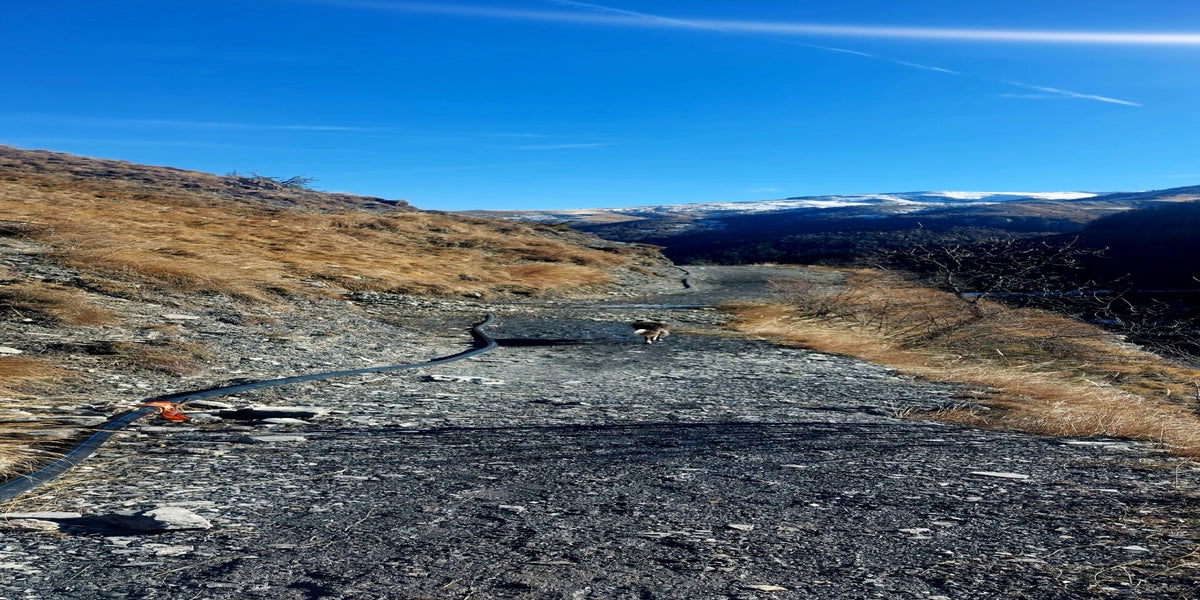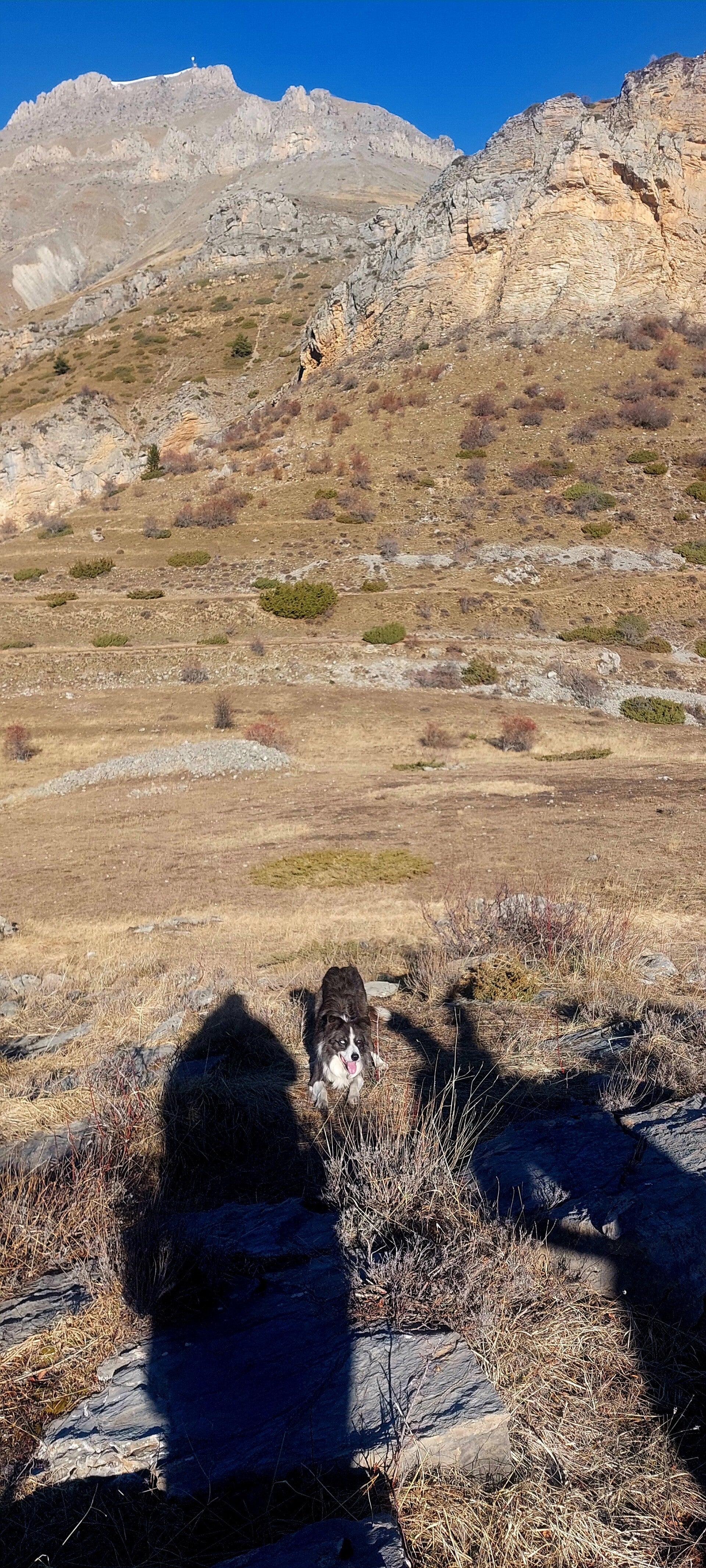 Bien plus haut, le sommet de Las Donnas (sommet le plus haut des pistes de ski d'Auron) est droit devant nous et le chien en position allongé, attend que Mélissa lance le cône de l'Épicéa.
