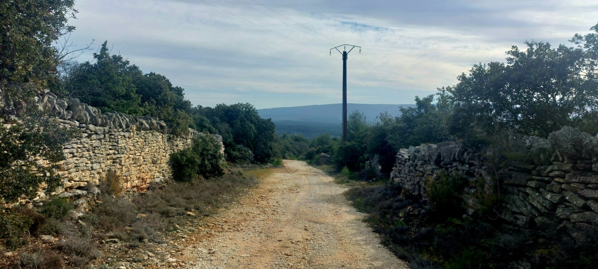 Nous sortons du village en longeant la route afin de rejoindre La Rouguière, un petit chemin goudronné qui nous mènera à un chemin entre deux grands murs de pierres.
