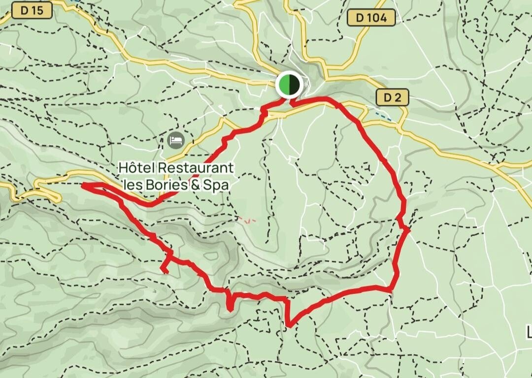 Nous avançons direction le village des Bories sans se soucier de la carte, puis par précaution, je jette un œil au tracé de la rando et je vois que nous faisons fausse route alors demi-tour toute.