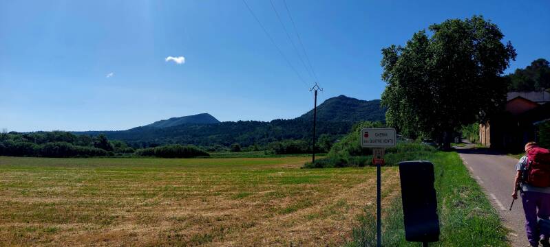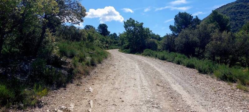 Bien plus loin, nous prenons en face à une intersection, puis nous passons dans cette petite forêt tout en observant le village de Pontevès.