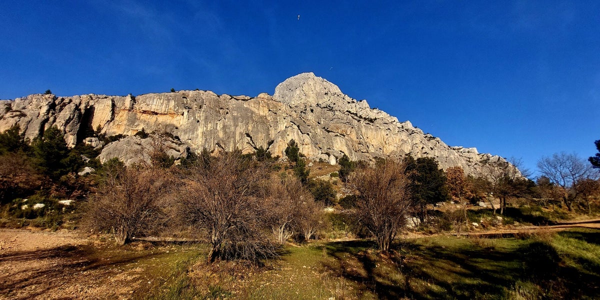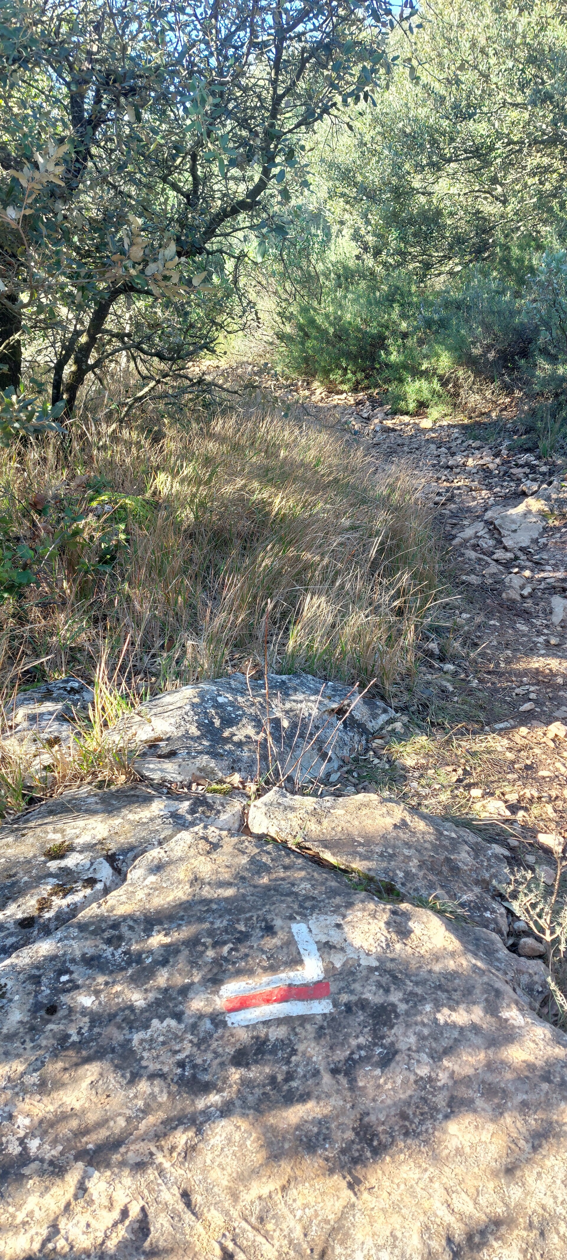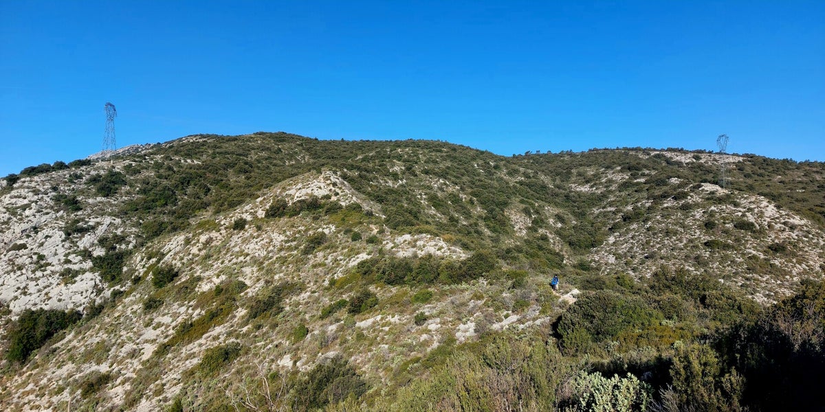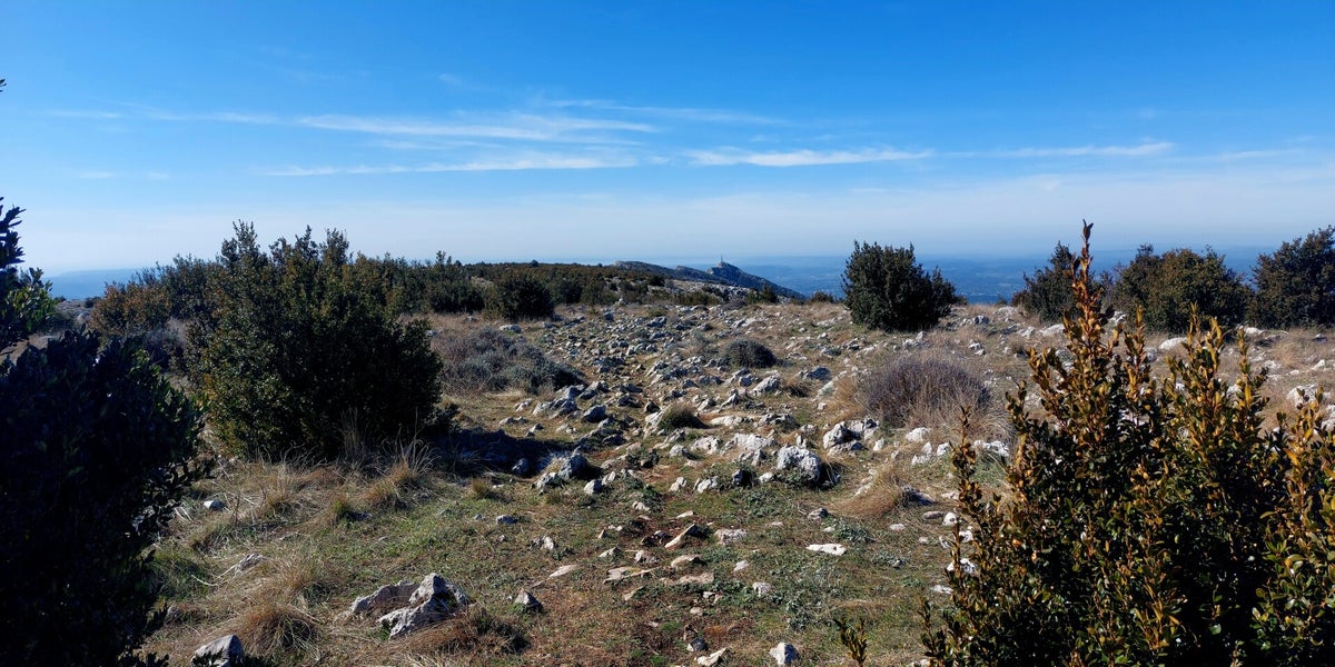 À peine arrivés au sommet, nos regards se tournent déjà vers l’horizon. Le Bau de l'Aigle et le Bau de Vespres apparaissent devant nous, imposants, comme des gardiens de cette terre. Et là, tout au loin, presque invisible, une petite forme se dessine : la croix de Provence, si lointaine qu’elle semble irréelle.