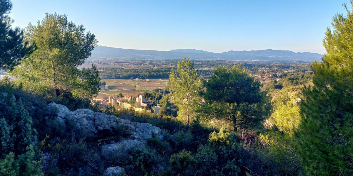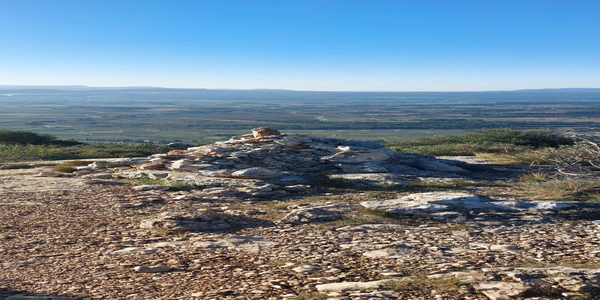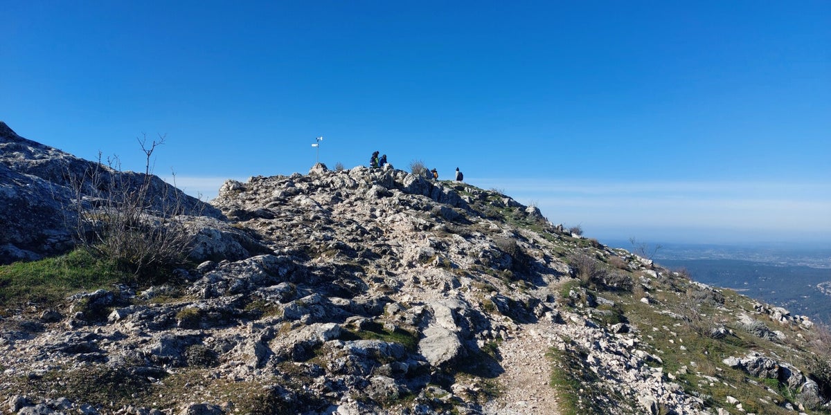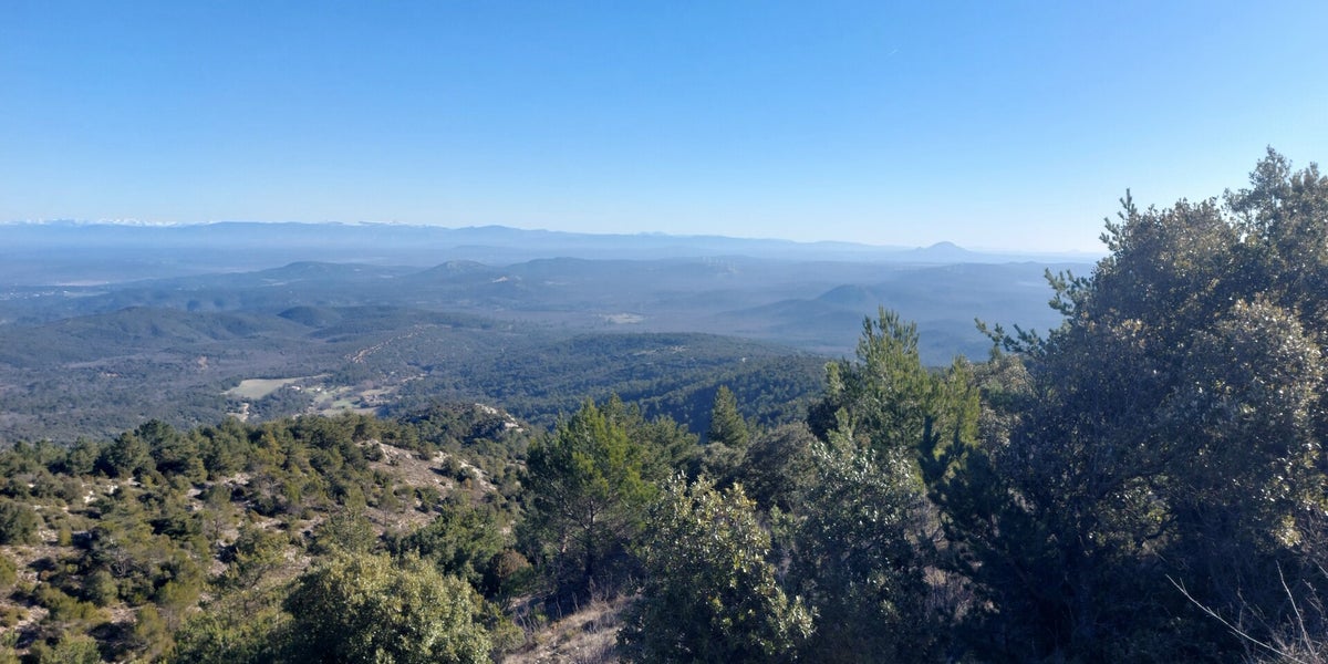À peine arrivés au sommet, nos regards se tournent déjà vers l’horizon. Le Bau de l'Aigle et le Bau de Vespres apparaissent devant nous, imposants, comme des gardiens de cette terre. Et là, tout au loin, presque invisible, une petite forme se dessine : la croix de Provence, si lointaine qu’elle semble irréelle.