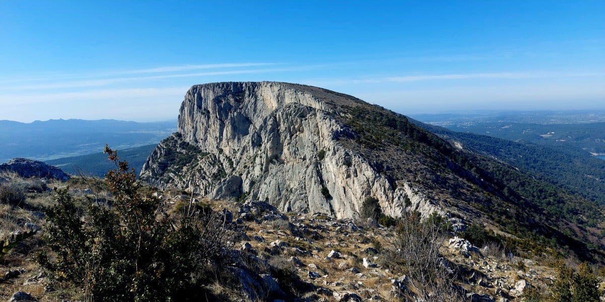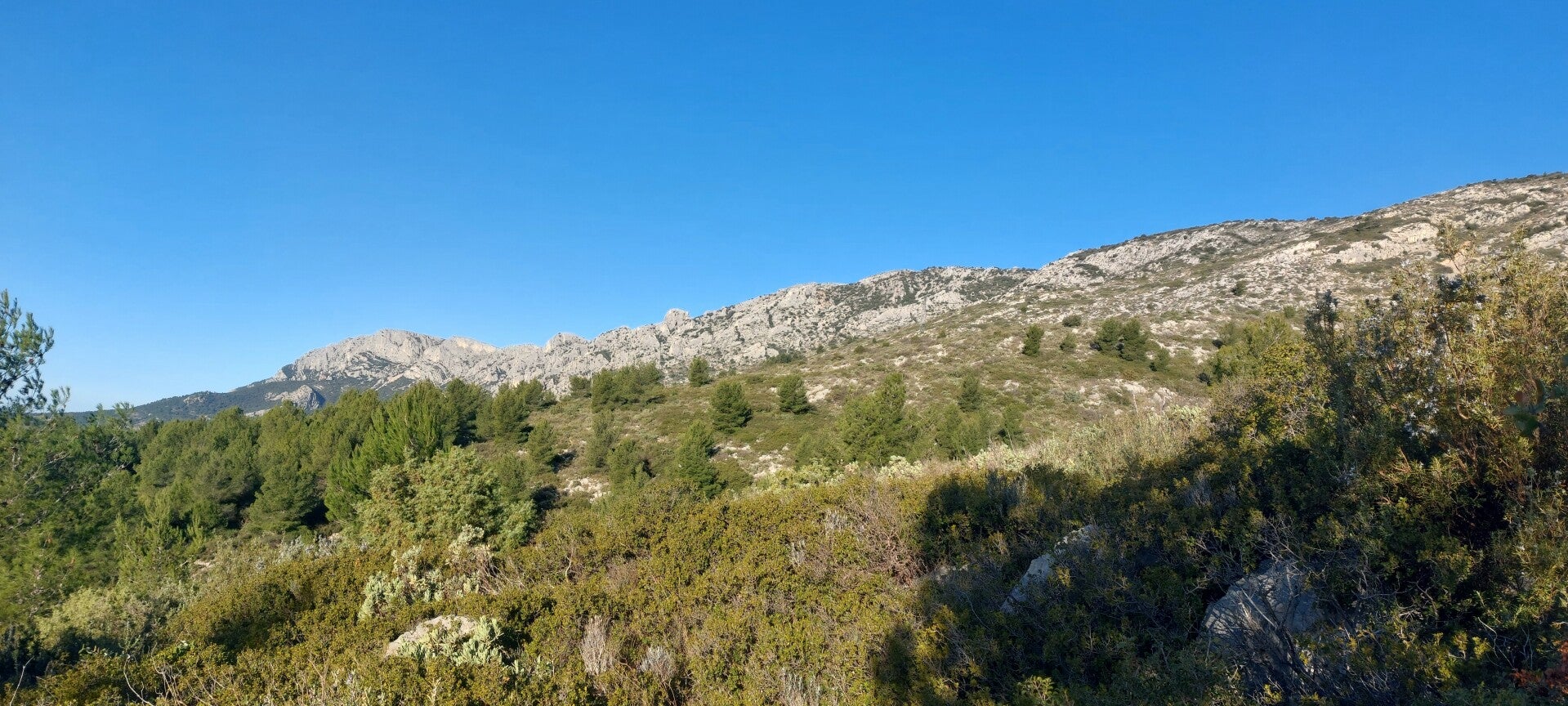 Là-bas, à l’horizon et à gauche, se dresse fièrement le pic de Bertagne, point culminant des Bouches-du-Rhône. Il semble presque à portée de main, baigné par la lumière du matin.