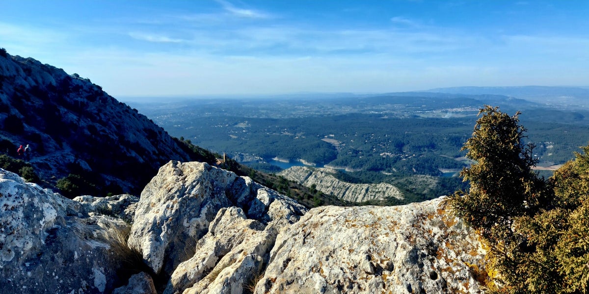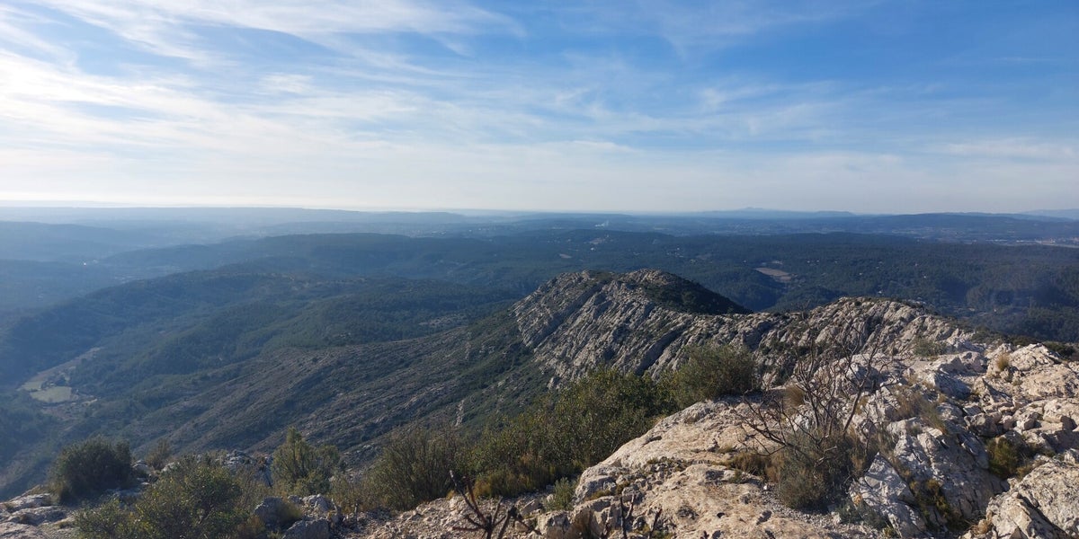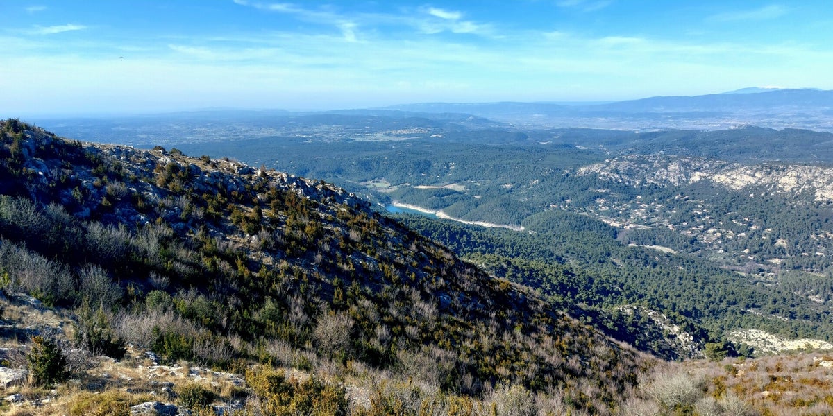 Au fil de notre ascension, le paysage se déploie sous nos yeux. Plus haut, nous dominons désormais le village de Puyloubier, blotti au pied de la montagne, et toute la vaste plaine qui s’étire à perte de vue.