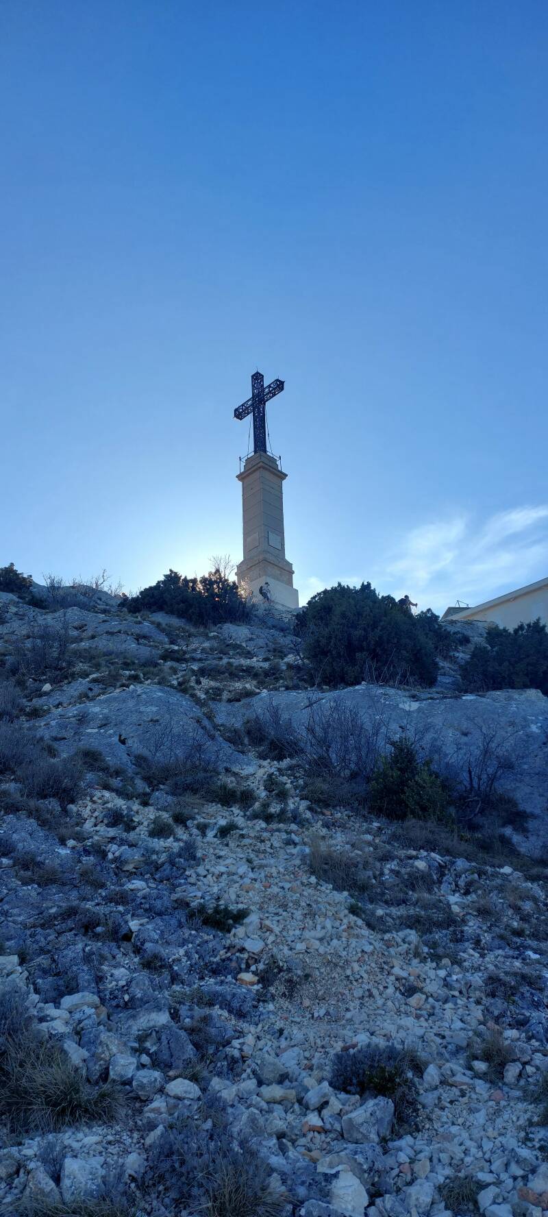Après tous ces efforts, nous sommes enfin arrivés au pied de la célèbre croix de Provence, symbole emblématique de la Sainte-Victoire. Ce monument impressionnant, qui culmine à 946 mètres, a été érigé en 1931 pour marquer la foi et l’histoire locale.