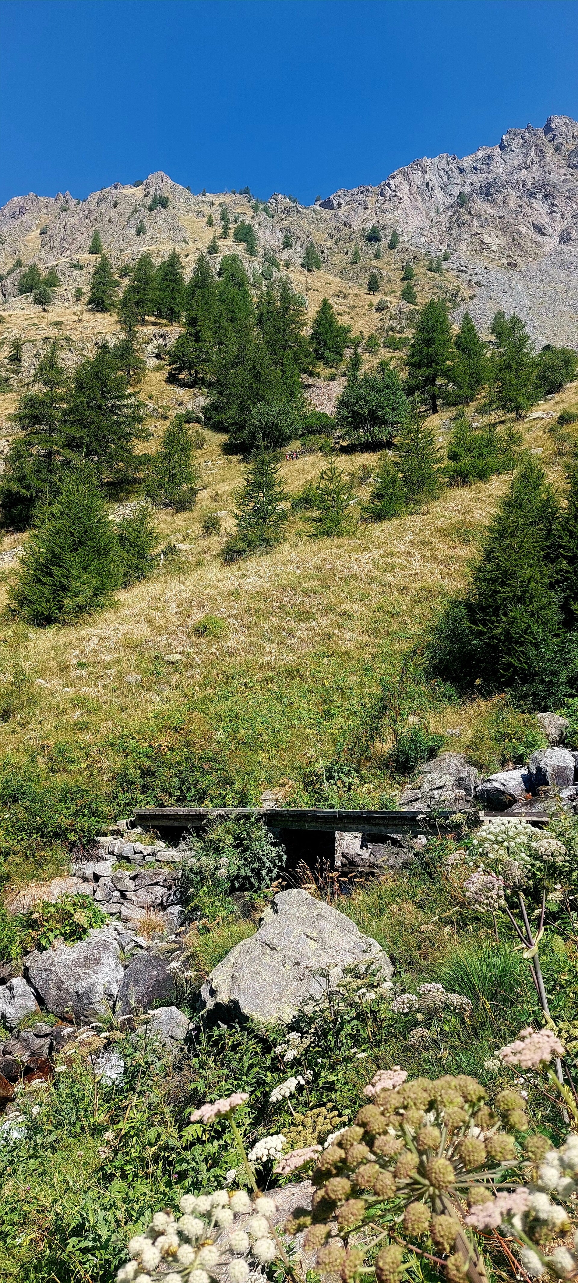 Perché sur ce pont, je me sens suspendu entre ciel et montagne, entre passé et présent. Le torrent de Vens cascade sous mes pieds, bondissant sur les rochers comme un joyeux enfant pressé de retrouver la vallée. Les mélèzes verts et vigoureux encadrent le cours d’eau, leurs aiguilles frémissant sous la caresse du vent. Plus haut, les sommets rocheux s’étirent vers le bleu infini, gardiens silencieux d’un monde ancien et paisible. L’air est vif, parfumé de mousse et de fleurs sauvages, et chaque son, du clapotis de l’eau au chant lointain d’un oiseau, semble composer une symphonie intime, faite pour qui sait prendre le temps d’écouter. Ici, sur ce pont, je suis à la fois témoin et acteur, et le paysage m’invite à suspendre mes pensées pour simplement exister au rythme de la montagne.