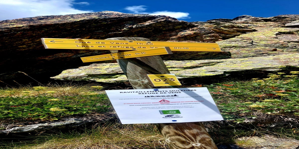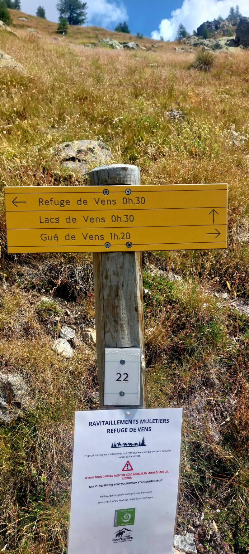 Il ne nous reste plus que dix minutes avant d’atteindre le refuge qui surplombe le premier lac. Cette fois-ci, j’ai pris le temps de lire l’affiche : le refuge est régulièrement ravitaillé par des mulets, véritables héros de la montagne ! 🐴