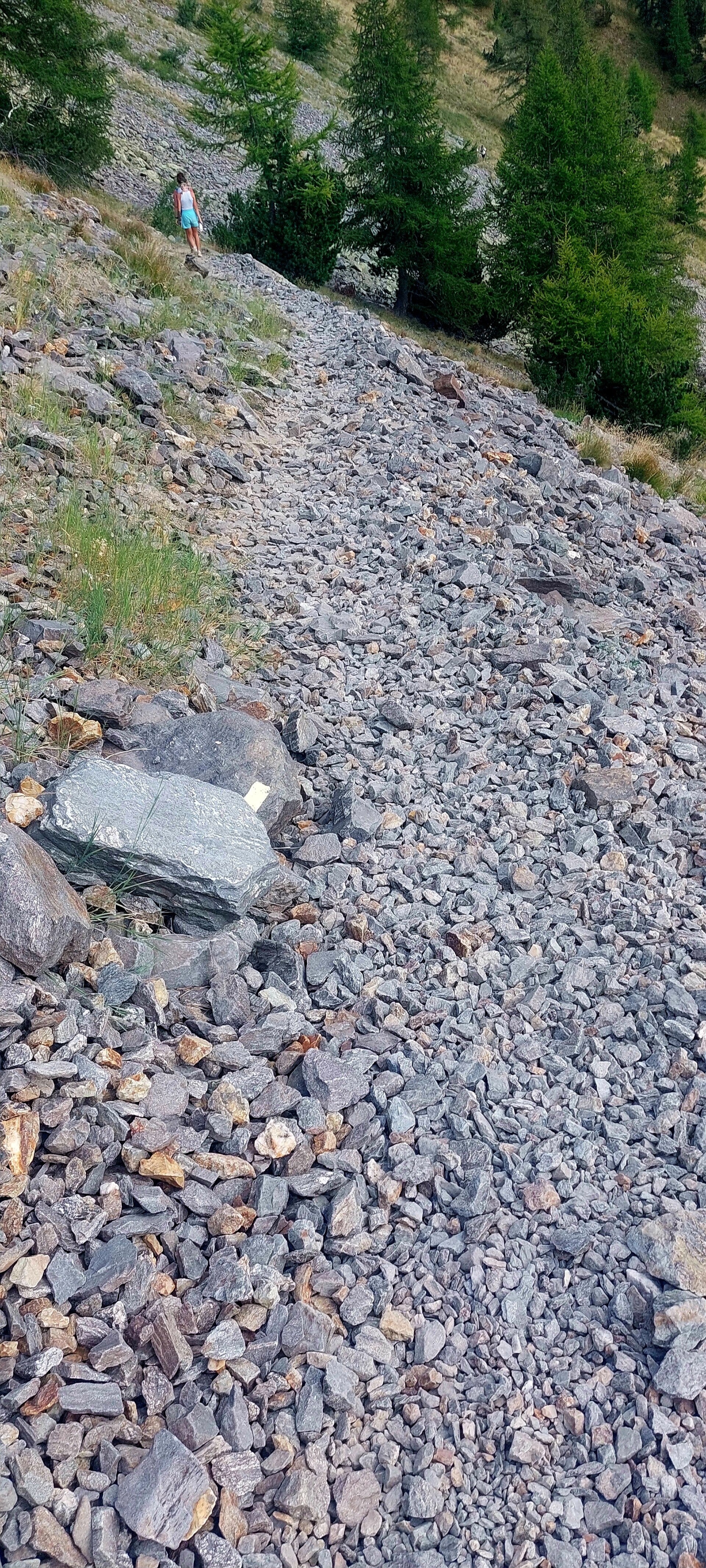On attaque la partie caillouteuse de la randonnée : ça glisse, ça roule et parfois ça bouge tout seul. Restez sur le sentier, marchez prudemment… et évitez de devenir la cible d’un caillou farceur ! 😅