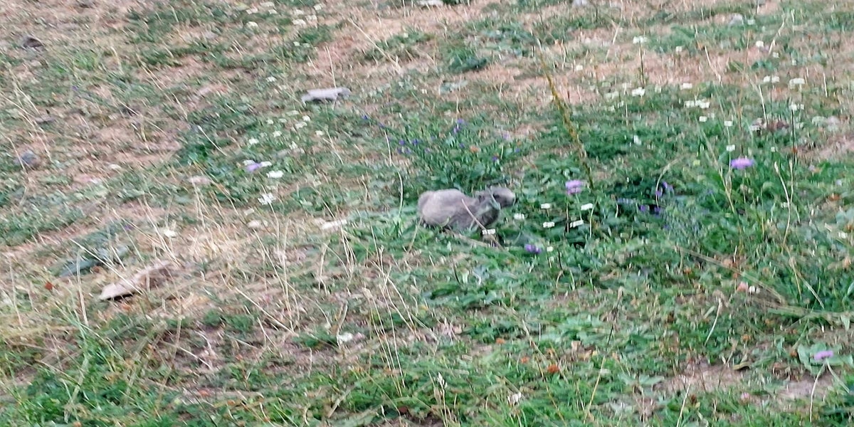 Quelques mètres après le pont, Ludivine aperçoit des marmottes. L’une part en cavale sur les hauteurs, l’autre campe fièrement devant son terrier. Nous nous approchons en douceur pour les photographier… mais celle que l’on voit sur la photo me paraît incroyablement mince. Trop mince, même ! Soit elle est malade, soit elle a mal hiberné… ou alors c’est une marmotte adepte du coaching sportif. Je reste choqué, surtout en voyant son cou si fin !