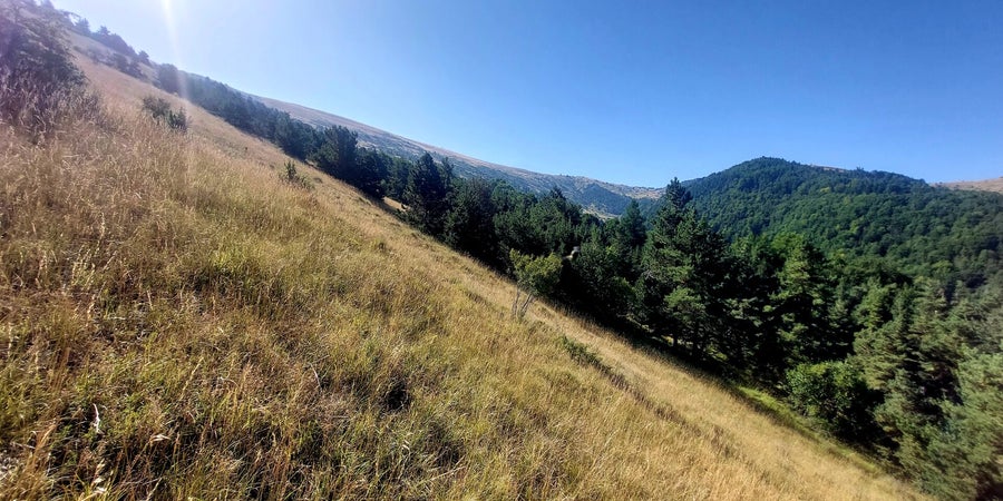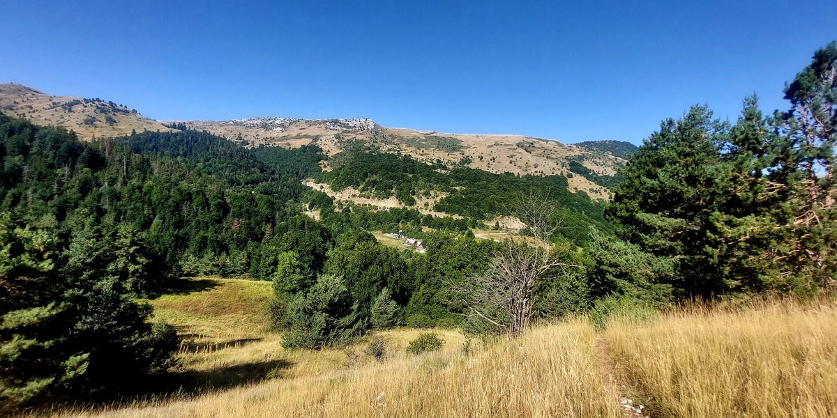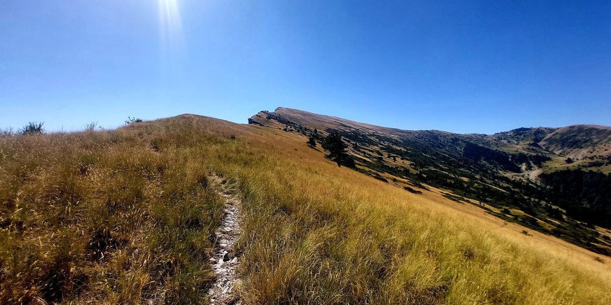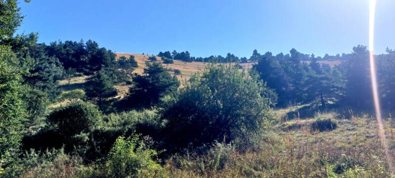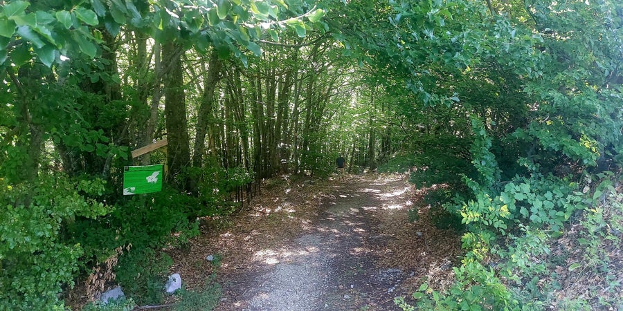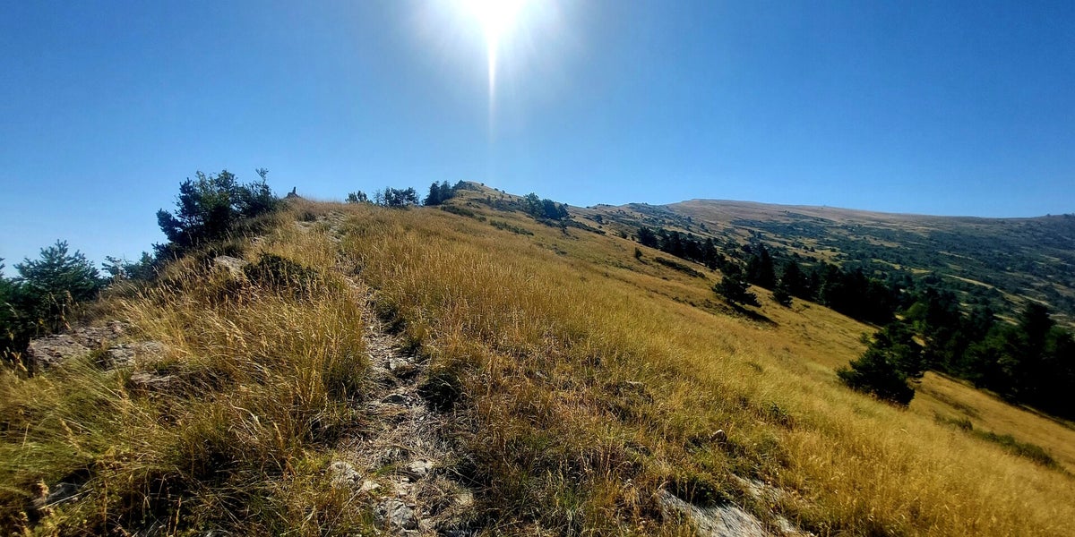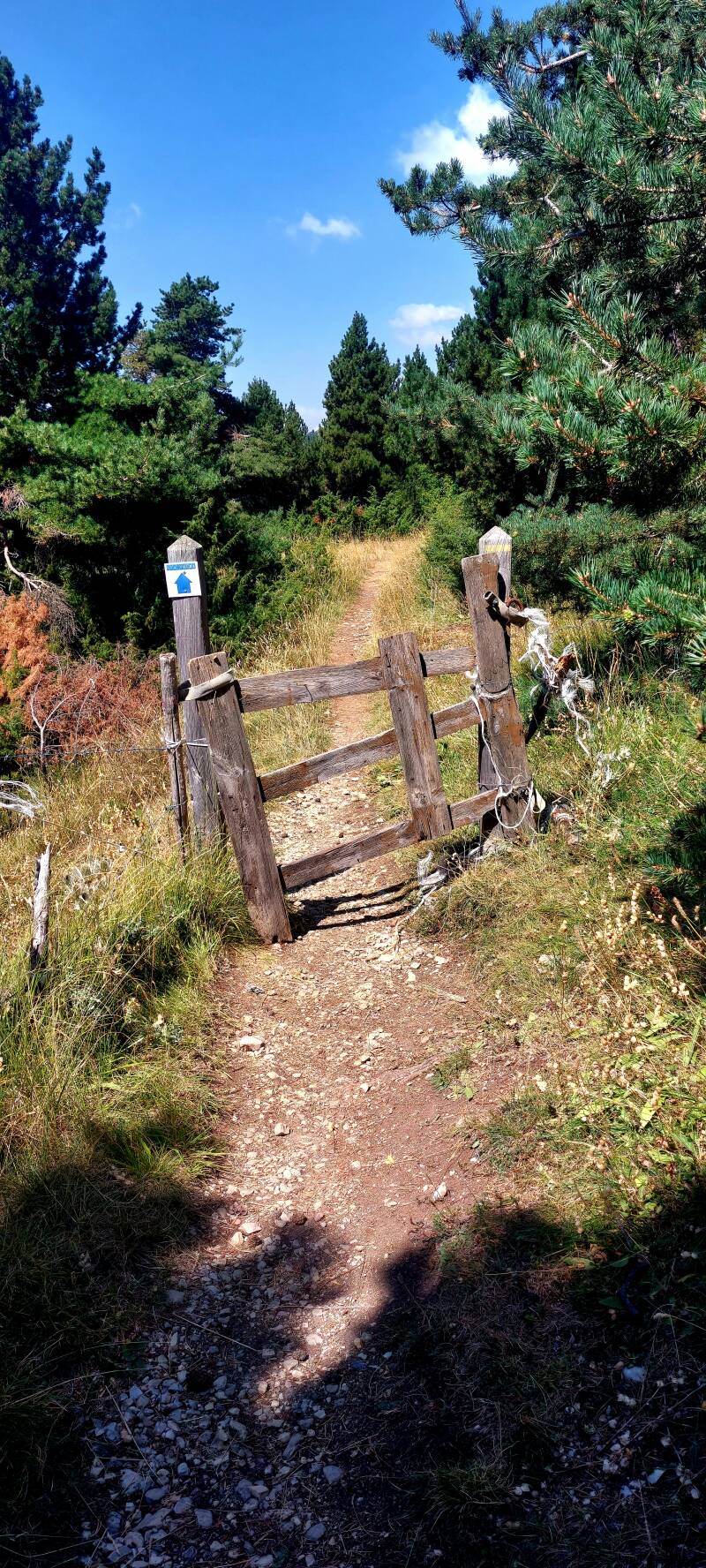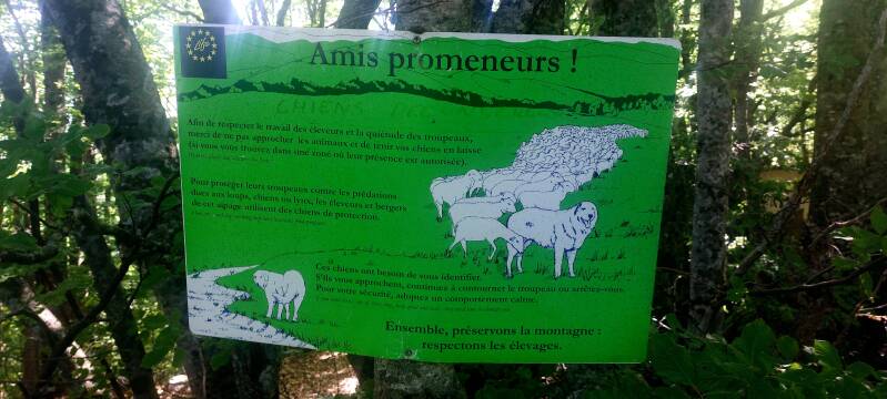 À peine les premiers pas, un panneau nous rappelle d’être attentifs aux troupeaux de moutons qui vivent ici, dans la montagne. L’aventure commence dans un passage ombragé, agréable mais bref… très vite, nous savons que la fraîcheur ne sera qu’un souvenir. Alors, pas question de ralentir : on poursuit notre chemin, ce sentier qui descend doucement, comme une invitation à aller plus loin, vers la découverte.