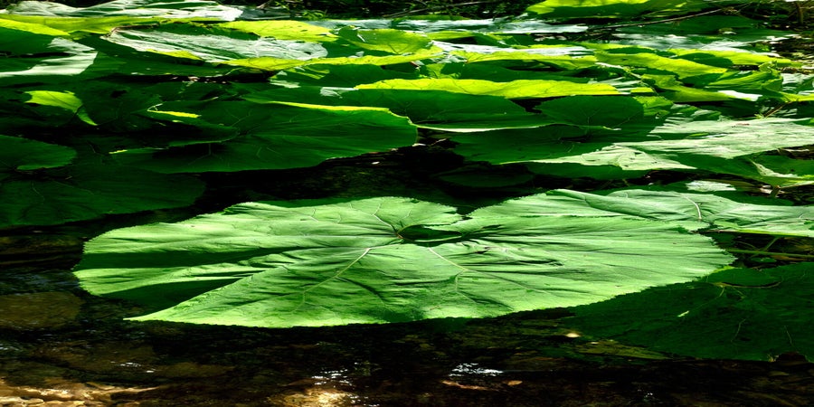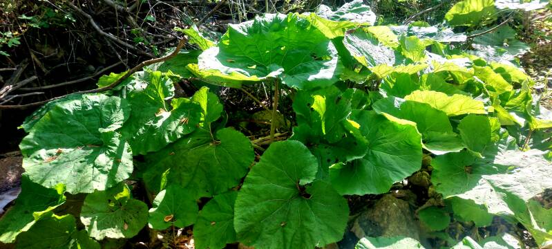 Sur la berge, impossible de ne pas remarquer le Grand Pétasite, avec ses feuilles énormes qui ressemblent presque à des parasols naturels. On dirait que la plante a décidé de créer son propre coin d’ombre au bord de l’eau. 🌿