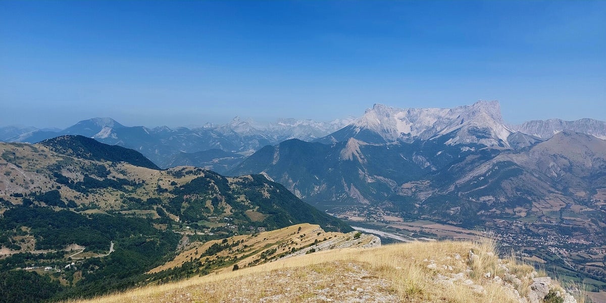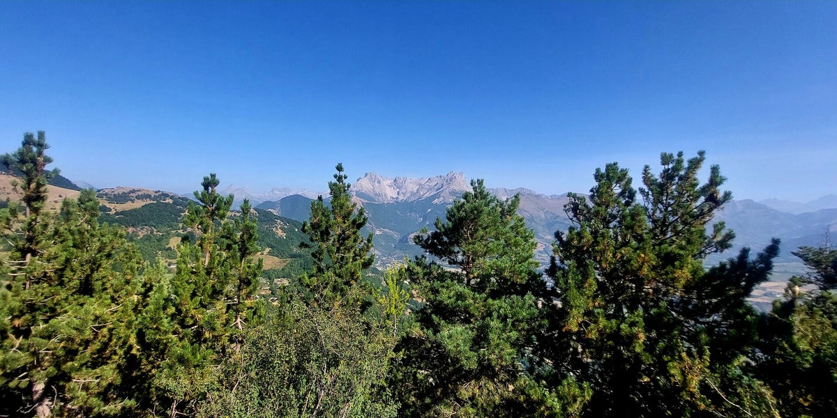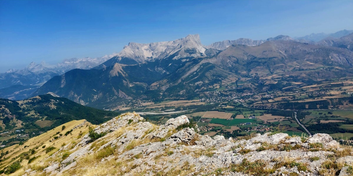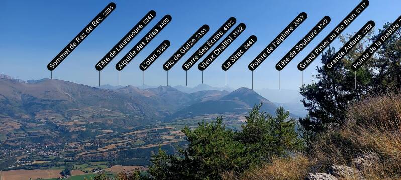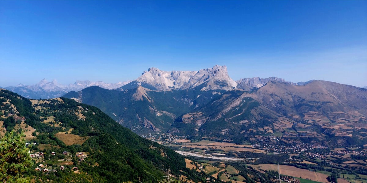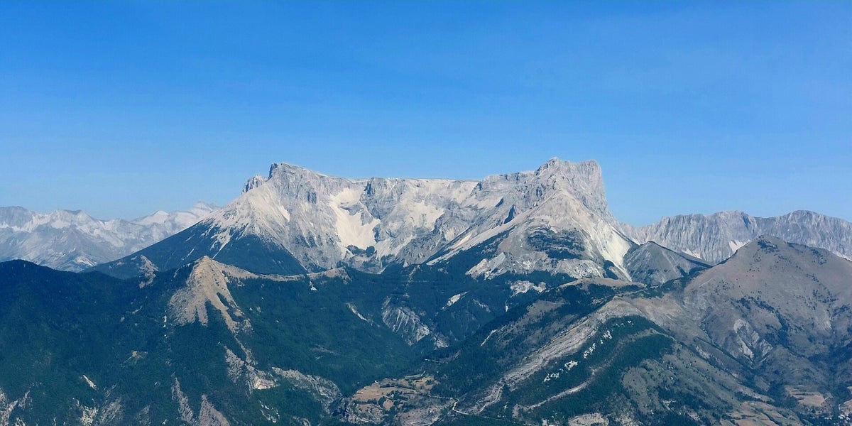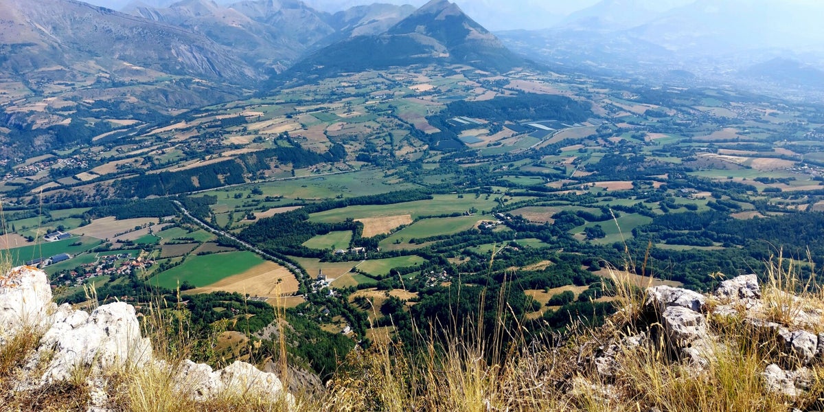 Sur la photo, on aperçoit tout au loin le haut des télésièges de la station de ski, et c’est exactement là que se trouve le pic de Céüse.