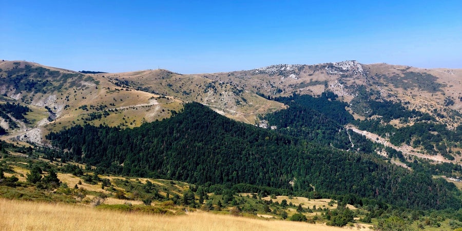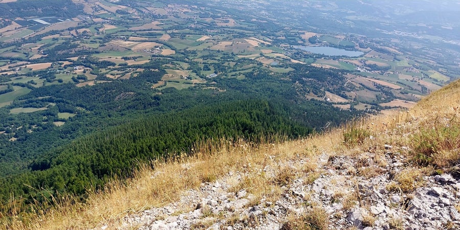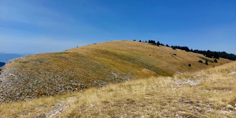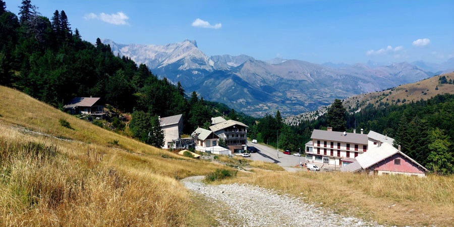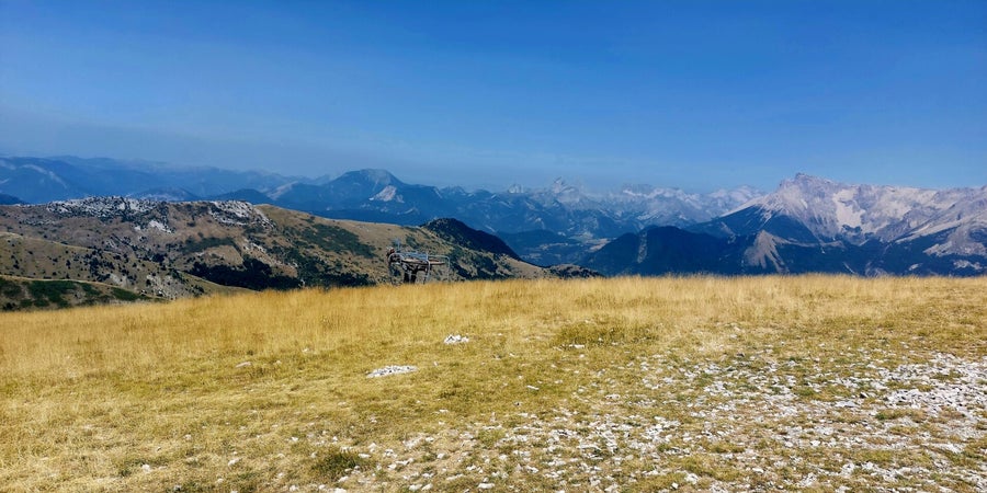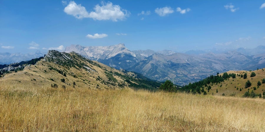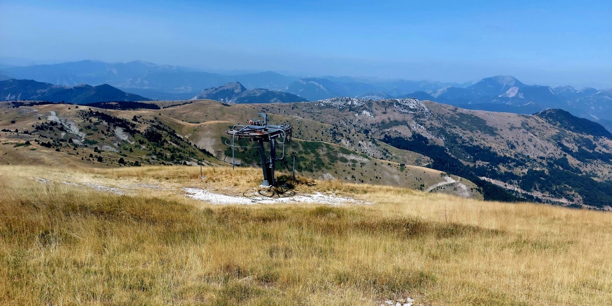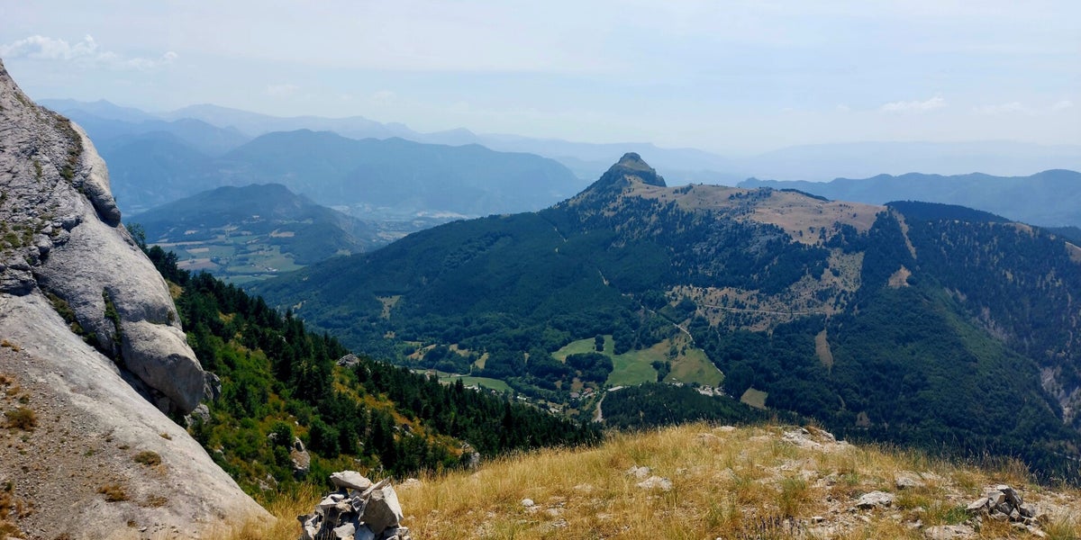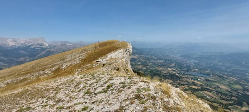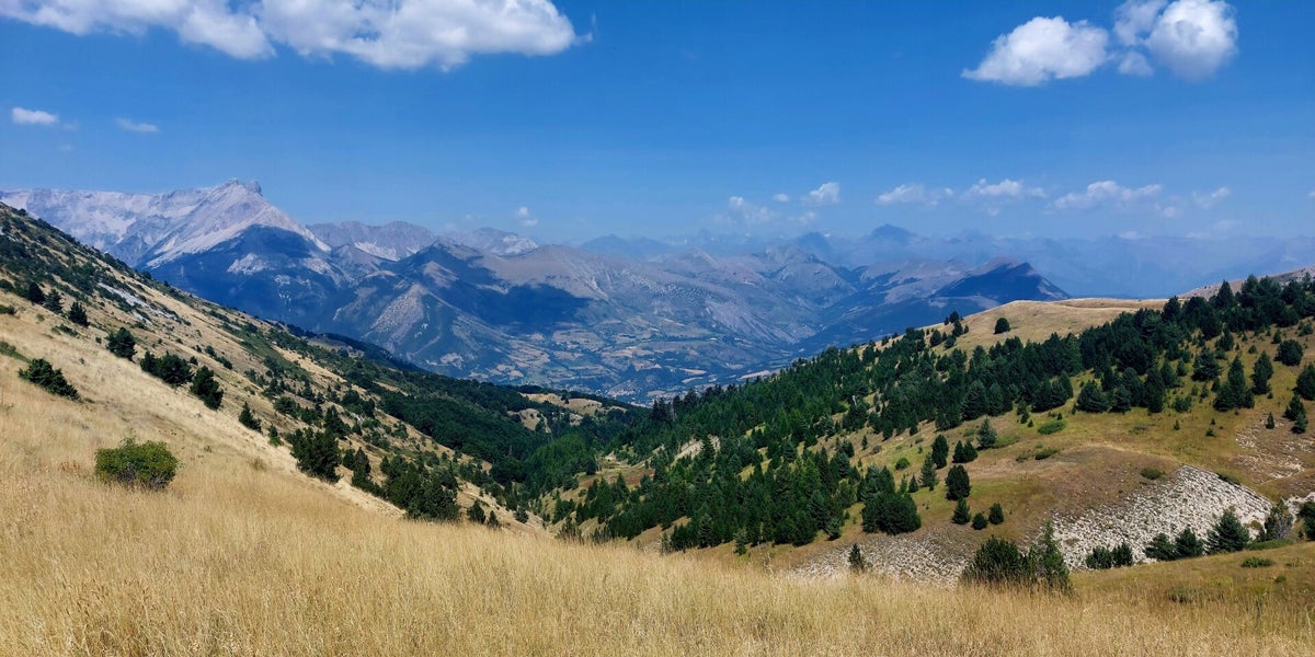 Sur la photo, on aperçoit tout au loin le haut des télésièges de la station de ski, et c’est exactement là que se trouve le pic de Céüse.