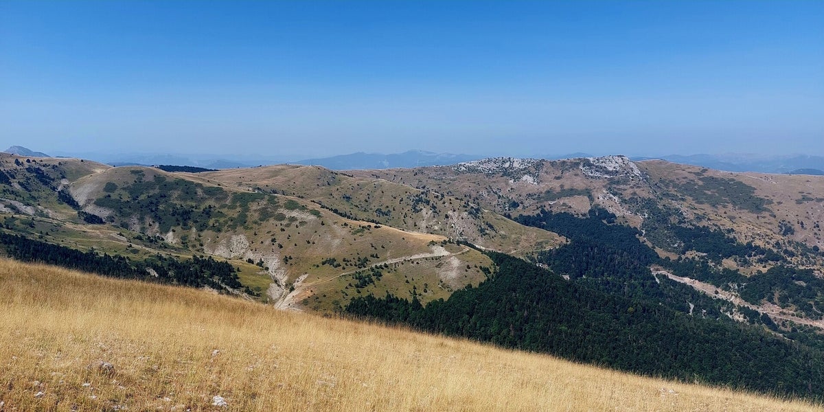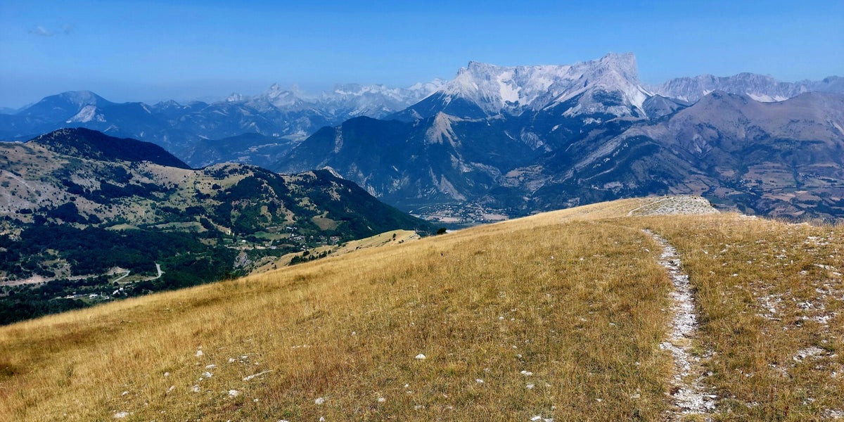 Après une courte pause, un peu plus haut que l’antenne, nous avons repris notre chemin sur le sentier pour rejoindre le cœur de la station. Sur notre droite (au centre de la photo), au loin, se dessine le pic de Céüse, là où nous étions plus tôt dans la journée. Je reste émerveillé par le relief que nous offre cette montagne, avec ses formes si particulières et sa grandeur impressionnante.