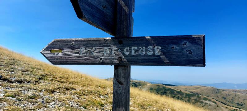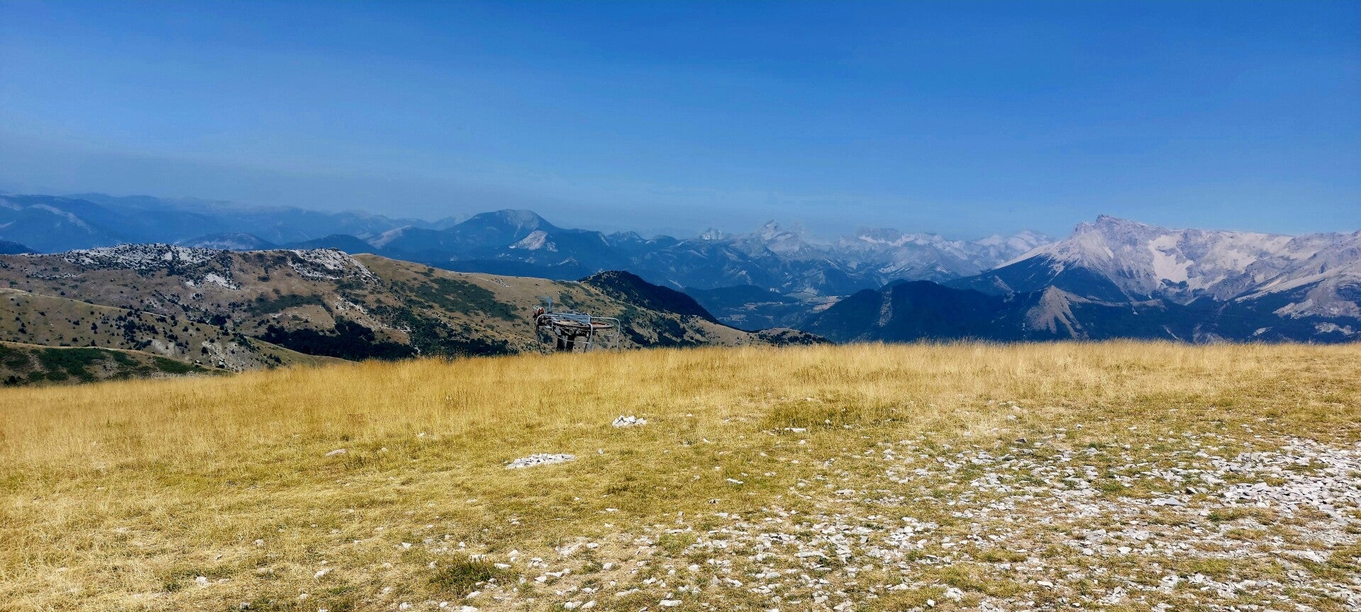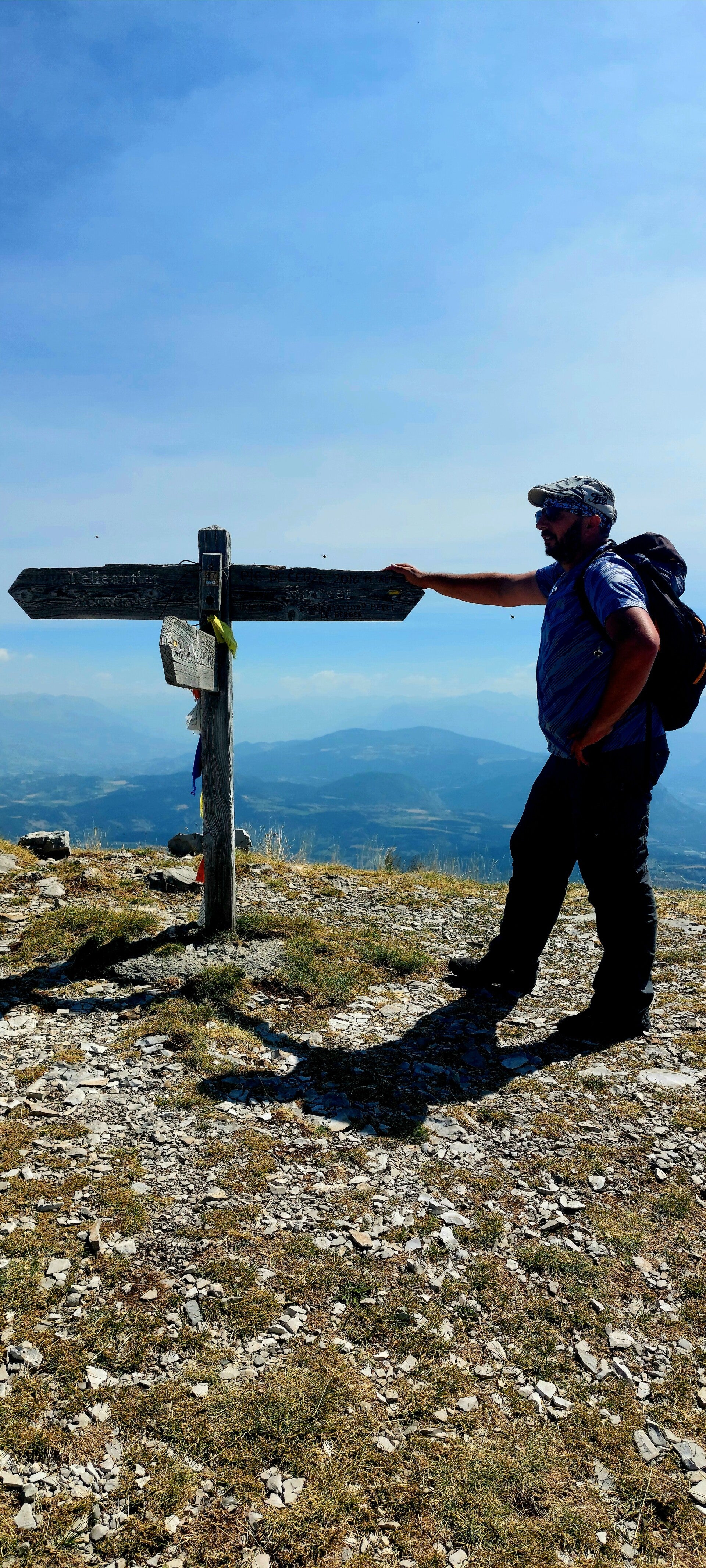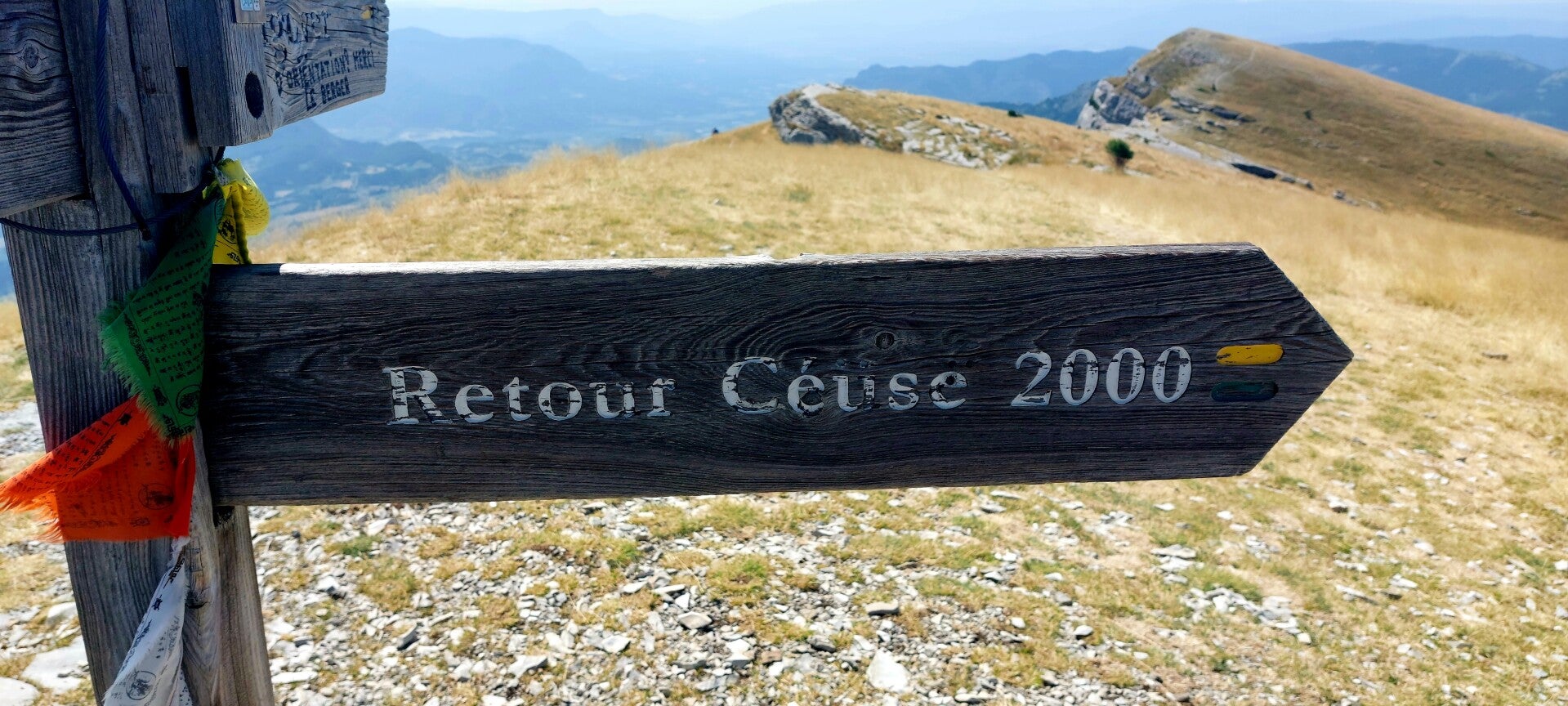 Après une montée pleine de sensations et d’efforts, nous avons enfin atteint le Pic de Céüse, à 2016 mètres d’altitude. Le sommet s’ouvre devant nous, imposant et un peu intimidant, et nous savourons cet instant comme de véritables aventuriers. Mais… les taons sont toujours là, tournant autour de nous comme de vrais vautours affamés ! On rigole, on se prend en photo, on tourne quelques vidéos pour les réseaux sociaux, puis, sans trop traîner, nous reprenons la randonnée, prêts pour la suite de cette aventure épique.