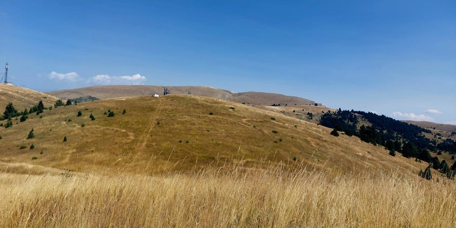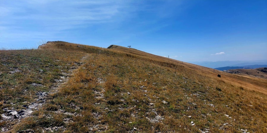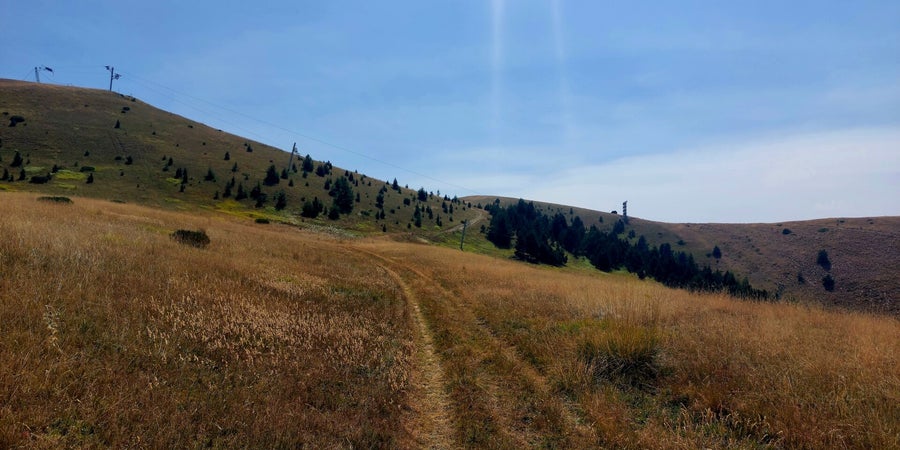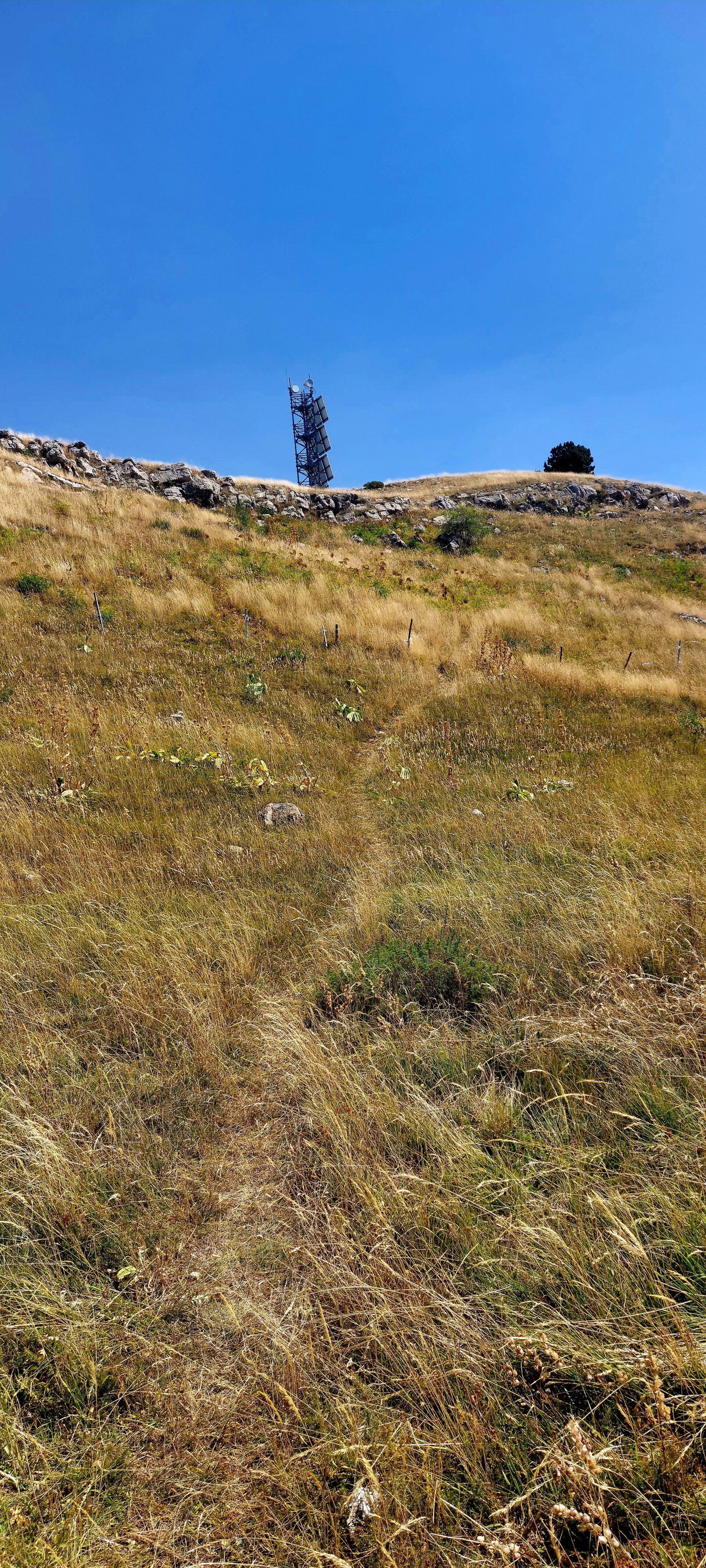 En regardant la carte sur Visorando, je me suis rendu compte que le tracé prévu était un peu plus long que ce que nous pensions. Mais j’avais repéré un petit sentier, que l’on voit sur les photos, et qui mène à cette espèce d’antenne. Ce passage se trouve entre le point 5 et le point 6 sur la carte de Visorando. J’ai donc choisi de passer par ce chemin afin de couper à travers la station de ski et de retrouver un peu plus rapidement la voiture, sachant qu’après la randonnée, il nous restait quand même deux bonnes heures de route pour rejoindre notre cher village.