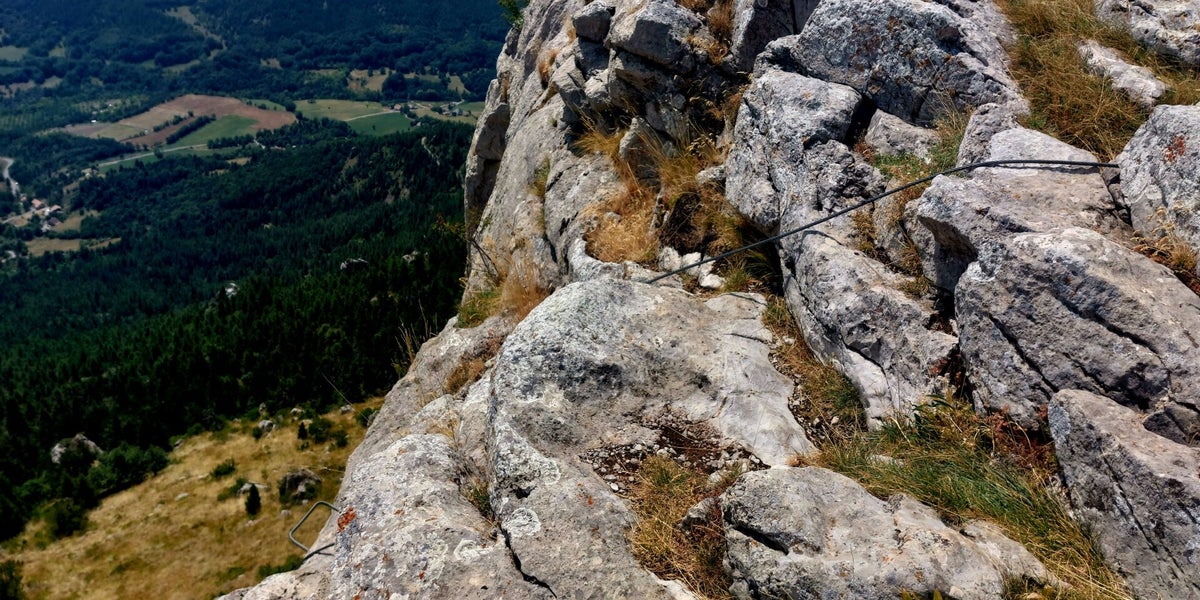Nous arrivons à un endroit qui a immédiatement attiré mon attention : le haut de la Via Ferrata de Céüse. En écrivant ces lignes, je prends le temps d’observer le parcours et de me renseigner un peu plus sur cette aventure verticale. J’ai même regardé quelques vidéos sur YouTube pour mieux comprendre le tracé. Cette Via Ferrata est relativement courte, mais elle culmine à 60 mètres de haut, ce qui reste impressionnant pour ceux qui aiment se mesurer aux parois.