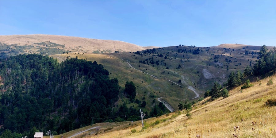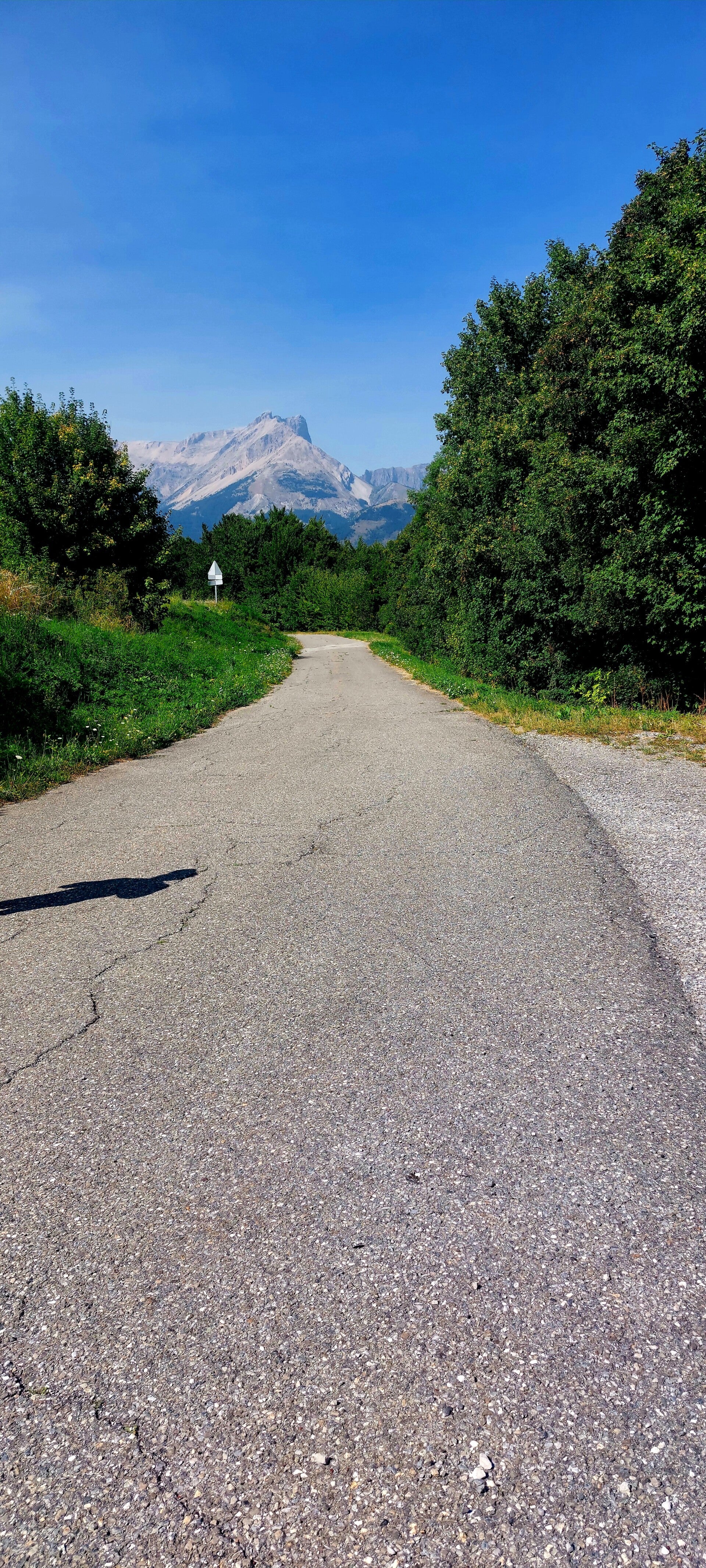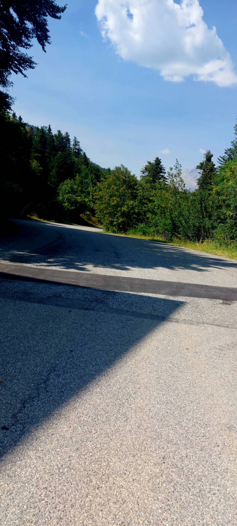 Vu la taille relativement modeste de la station de ski de Céüse, je reste très impressionné par la largeur de la route sur laquelle nous nous trouvons. Par simple curiosité, j’ai pris la mesure un peu plus bas que sur la photo : nous étions alors à 11 mètres de large. À l’entrée de la station, cette largeur pourrait même atteindre 15 mètres. Je reste donc assez surpris : pour une station si petite, pourquoi construire une route aussi large ?