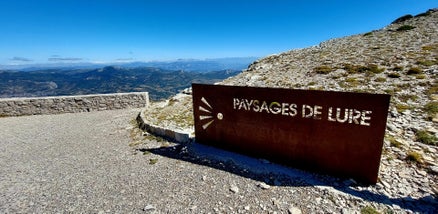 À l'entrée du parking, je commence à prendre des photos de la plaque "Montagne de Lure" et de la vue avant d'attaquer le sentier qui descend vers le Creux des Chamois.